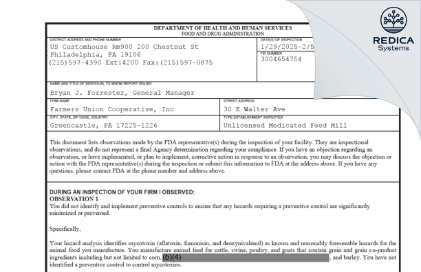Farmers Union Cooperative, Inc - Form 483, 2025-02-05