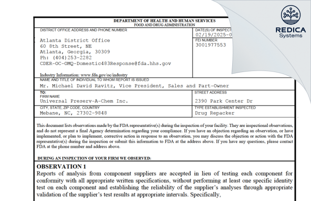 Universal Preserv-A-Chem - Form 483, 2025-02-26