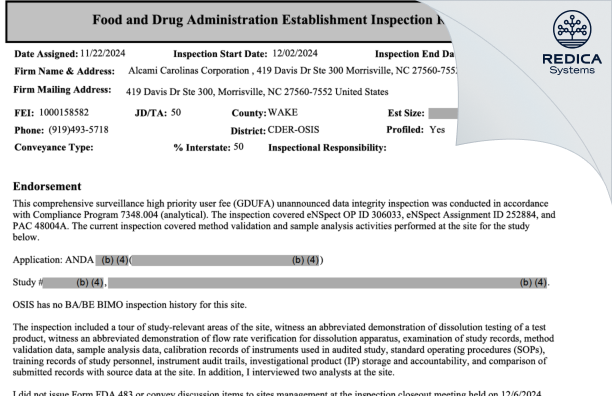 Alcami Carolinas Corporation - EIR, 2025-03-03