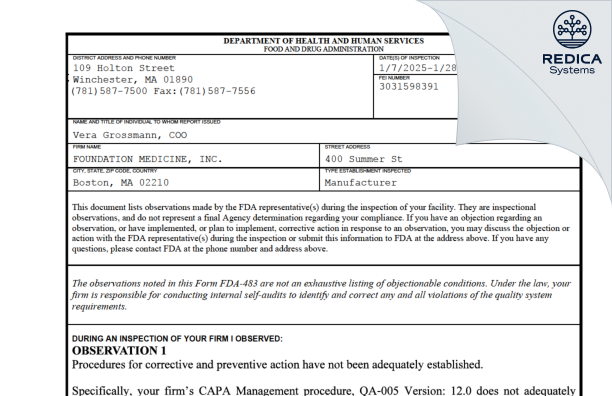 FOUNDATION MEDICINE, INC. - Form 483, 2025-01-28