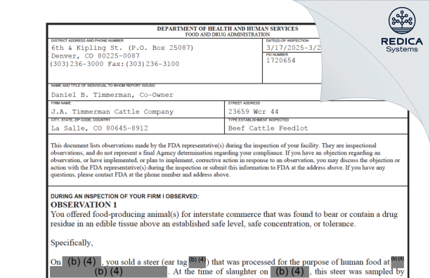 J.A. Timmerman Cattle Company - Form 483, 2025-03-27