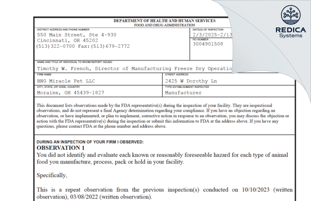 BNG Miracle Pet LLC - Form 483, 2025-02-13