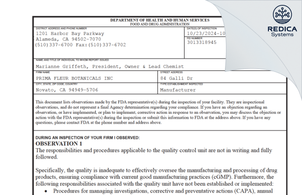 PRIMA FLEUR Botanicals, Inc. - Form 483, 2024-10-30