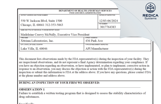 Xttrium Laboratories, Inc. - Form 483, 2024-12-06