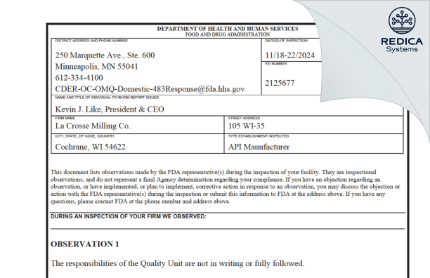 La Crosse Milling Company - Form 483, 2024-11-22