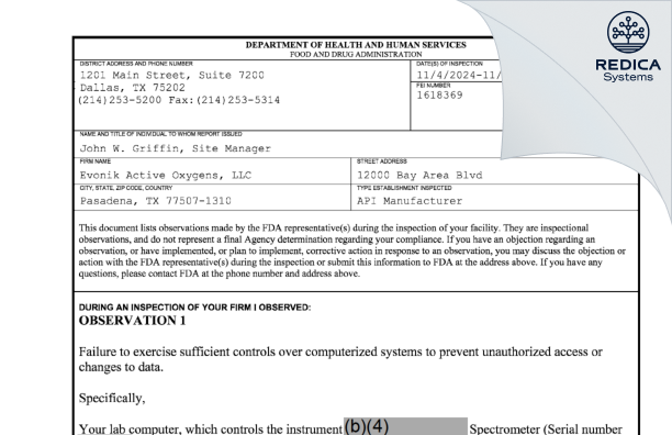 Evonik Active Oxygens, LLC - Form 483, 2024-11-06