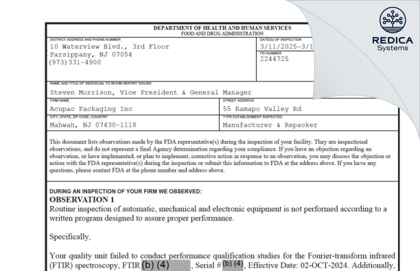 ACUPAC PACKAGING INC - Form 483, 2025-03-14