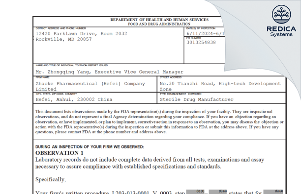 Zhaoke Pharmaceutical (Hefei) Company Limited - Form 483, 2024-06-18