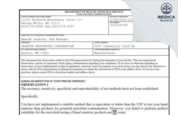Celeste Industries Corporation - Form 483, 2025-02-28