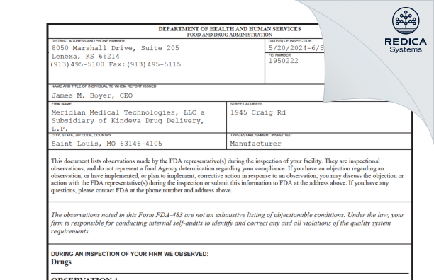 Meridian Medical Technologies, LLC - Form 483, 2024-06-05