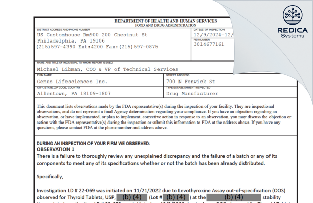 Genus Lifesciences Inc. - Form 483, 2024-12-13