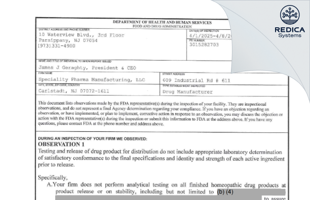 Speciality Pharma Manufacturing, LLC - Form 483, 2025-04-08