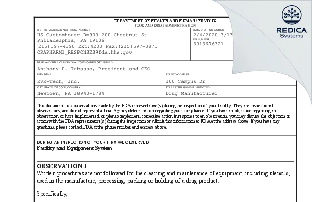 Document Type:FDA 483Inspection Duration:March, 2020 - March, 2020Site:KVK-TECH, INC [Newtown / United States of America]FEI:3013676321Investigator(s):Nancy M Espinal, Michele GottshallRedica ID:100111525Purchase LinkPurchase KVK-TECH, INC - Form 483, 2020-03-13