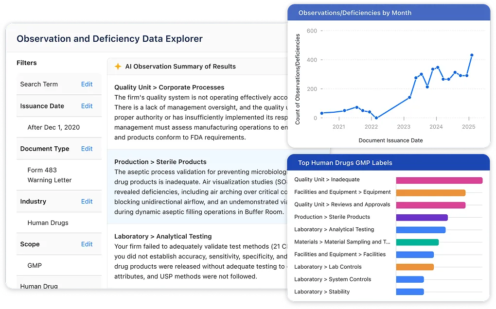 - General enforcement action detail across FDA 483s, Warning Letters, Import Alerts, MHRA Deficiency Reports, etc.